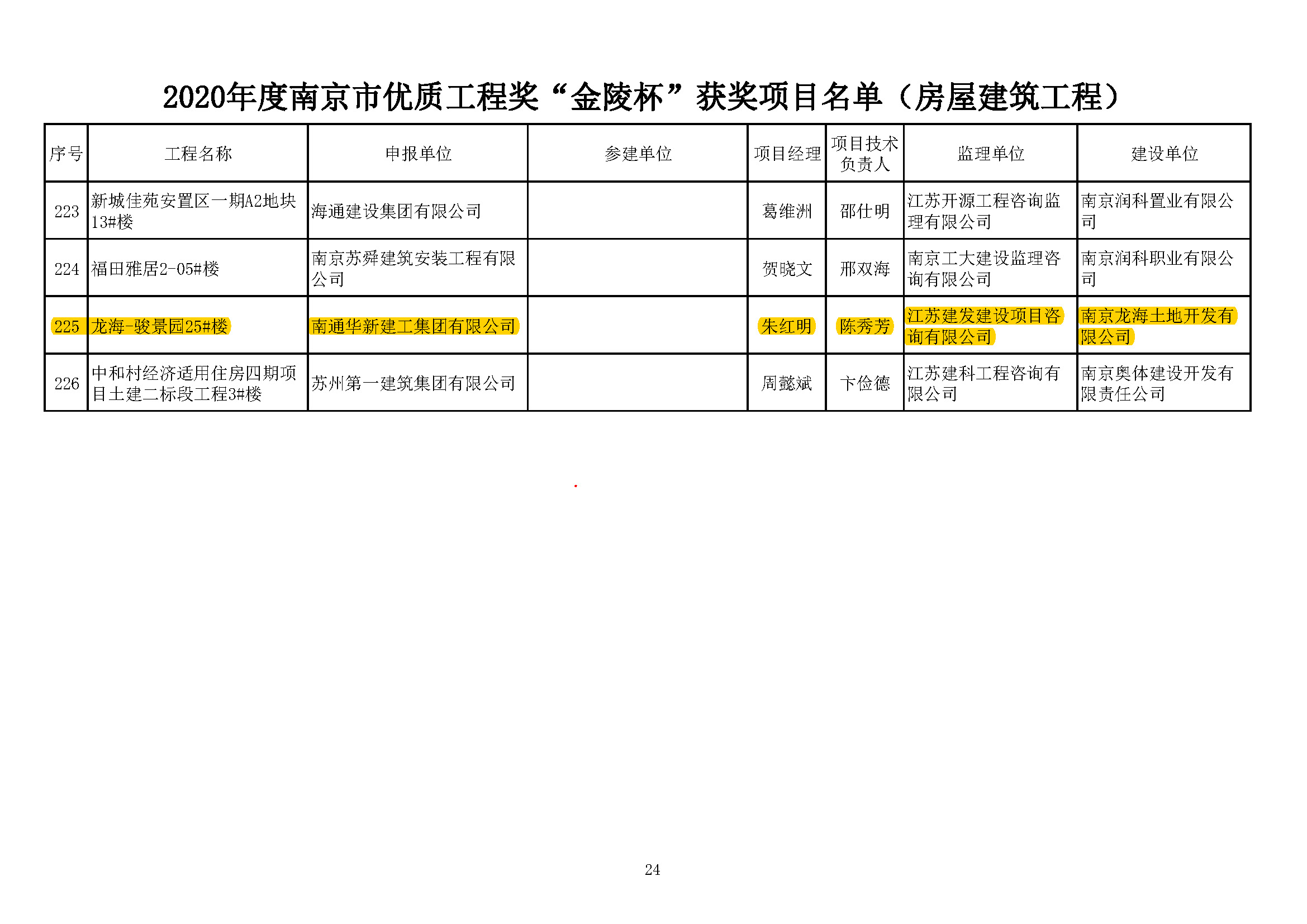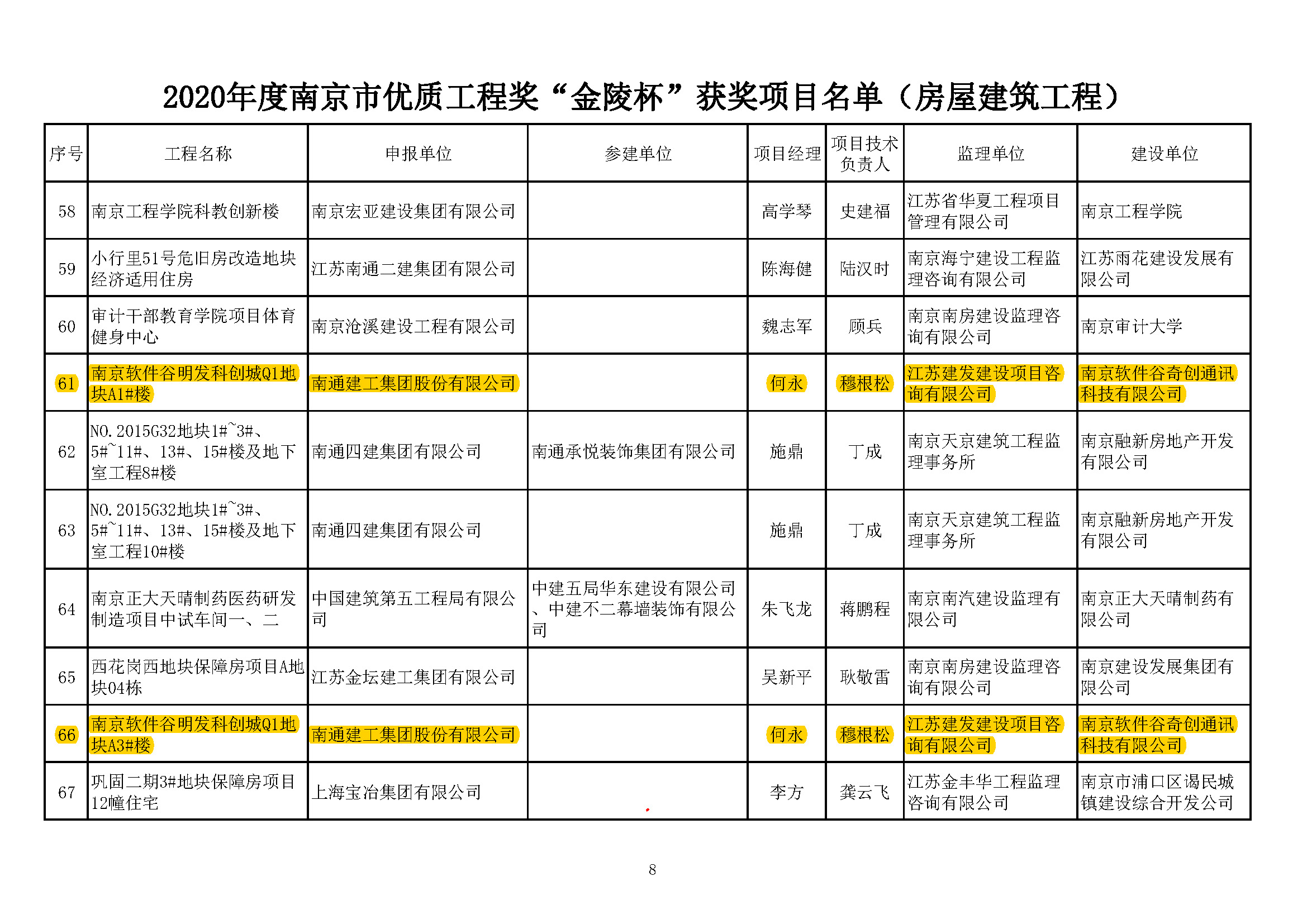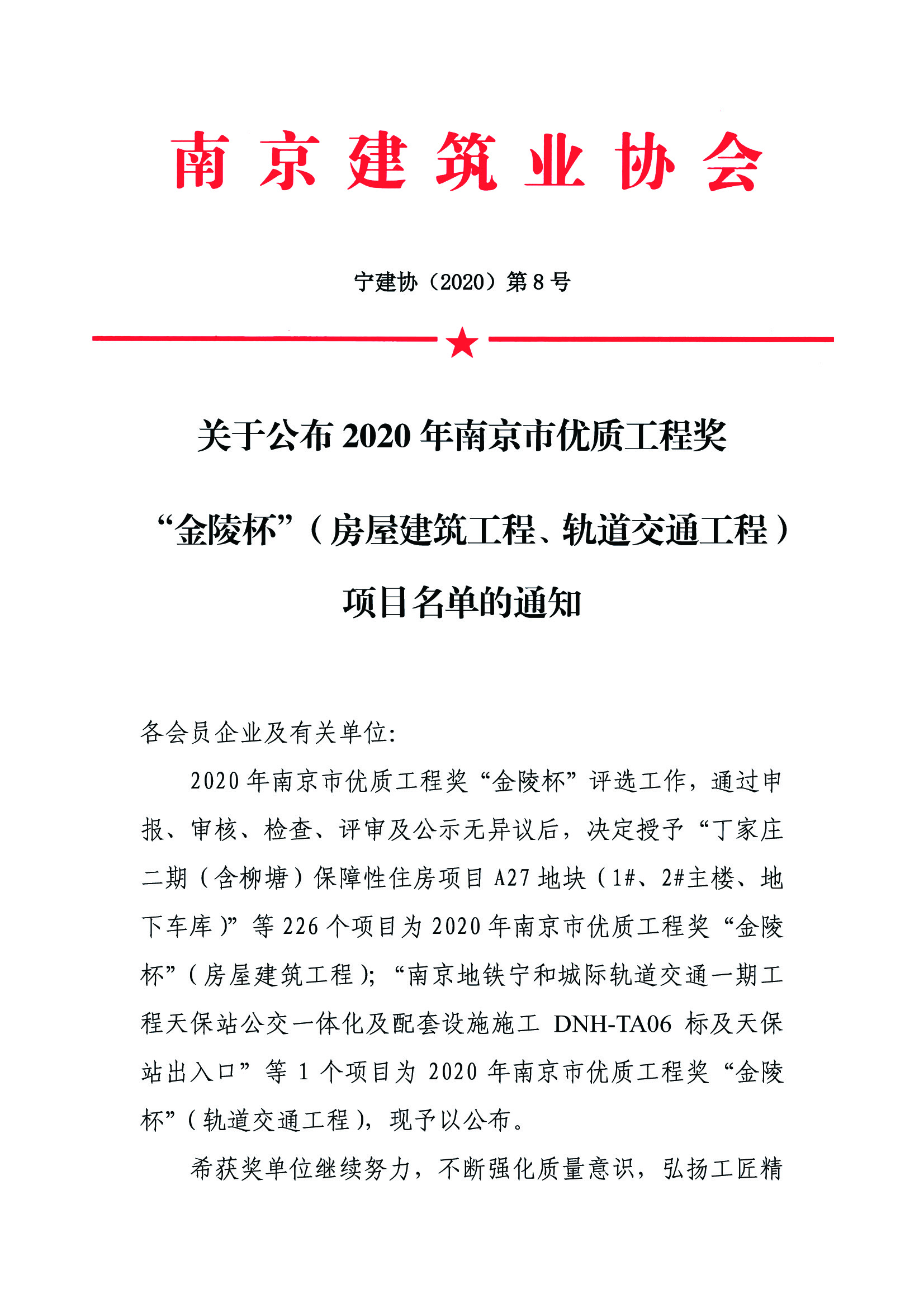 根據(jù)南京建筑業(yè)協(xié)會(huì)寧建協(xié)(2020)第8號(hào)文《關(guān)于公布2020年南京市優(yōu)質(zhì)工程獎(jiǎng)“金陵杯"(房屋建筑工程、軌道交通工程)項(xiàng)目名單的通知》公布的結(jié)果,2020年南京市優(yōu)質(zhì)工程獎(jiǎng) “金陵杯”評(píng)選工作,通過(guò)申報(bào)、審核、檢查、評(píng)審及公示無(wú)異議后,現(xiàn)已完成,我公司監(jiān)理的南京軟件谷明發(fā)科創(chuàng)城Q1地塊A1#樓、南京軟件谷明發(fā)科創(chuàng)城Q1地塊A3#樓、江寧九龍湖國(guó)際企業(yè)總部園北1號(hào)樓、龍海-駿景園25#樓等四項(xiàng)工程被授予2020年南京市優(yōu)質(zhì)工程獎(jiǎng) “金陵杯”(房屋建筑工程),特此祝賀!