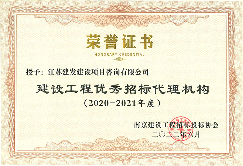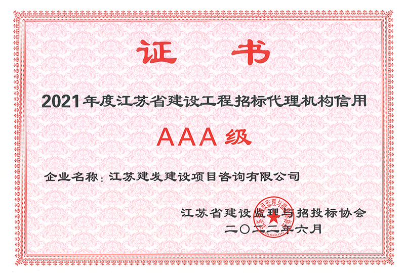 我公司榮獲2021年度江蘇省建設(shè)工程招標(biāo)代理機(jī)構(gòu)AAA級(jí)證書及南京市2020-2021年度建設(shè)工程優(yōu)秀招標(biāo)代理機(jī)構(gòu)榮譽(yù)證書